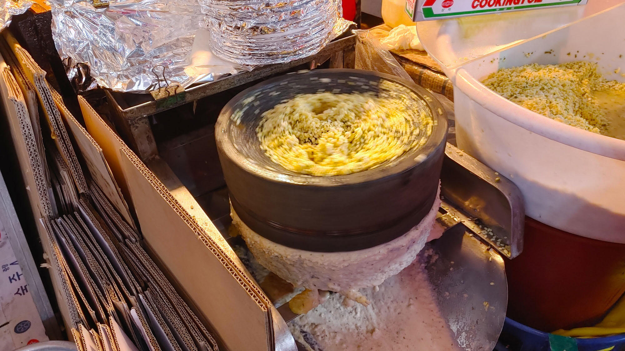 대두를 이렇게 직접 맷돌에 갈아서 빈대떡 재료를 만듭니다.