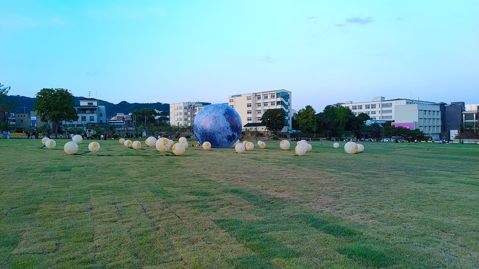 해질무렵의 고층빌딩가와 드넓은 꽃밭의 조화는 비현실적인 느낌마져 들게합니다.
